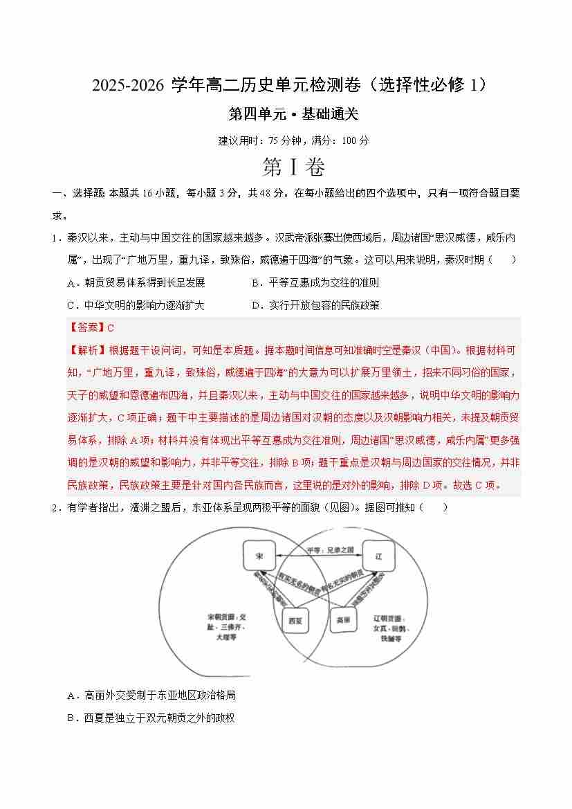首页 > 全部 > 单元测试 > 高二历史选择性必修1第四单元测试·基础卷(教师版)