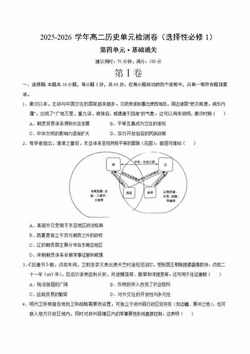 高二历史选择性必修1第四单元测试·基础卷(考试版A4)