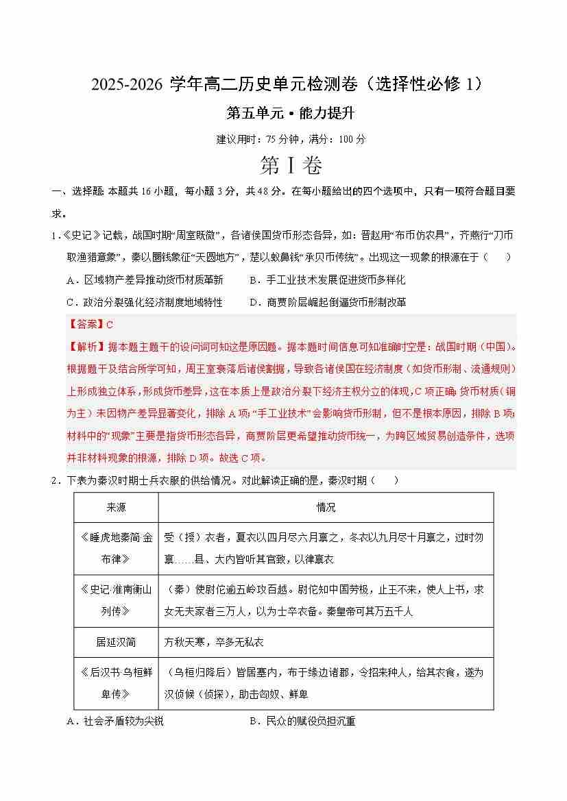 首页 > 全部 > 单元测试 > 高二历史选择性必修1第五单元测试·提升卷(教师版)