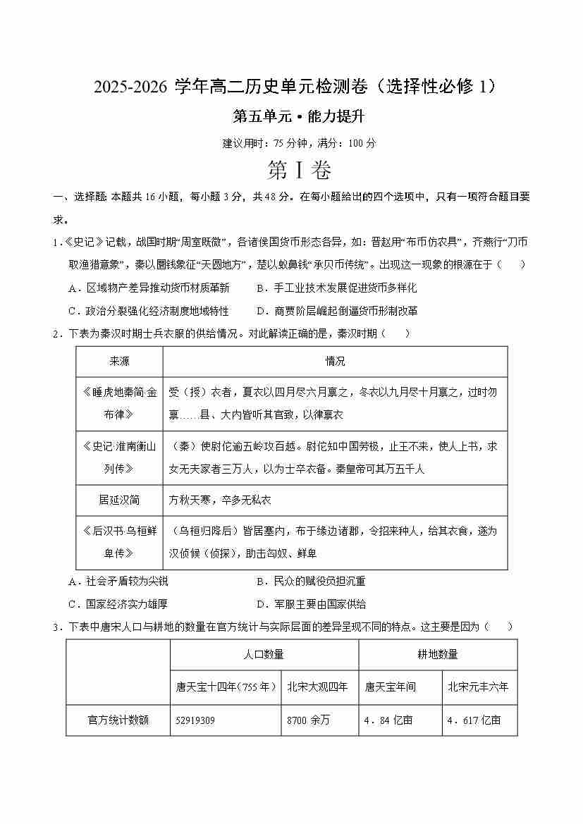 首页 > 全部 > 单元测试 > 高二历史选择性必修1第五单元测试·提升卷(考试版A4)