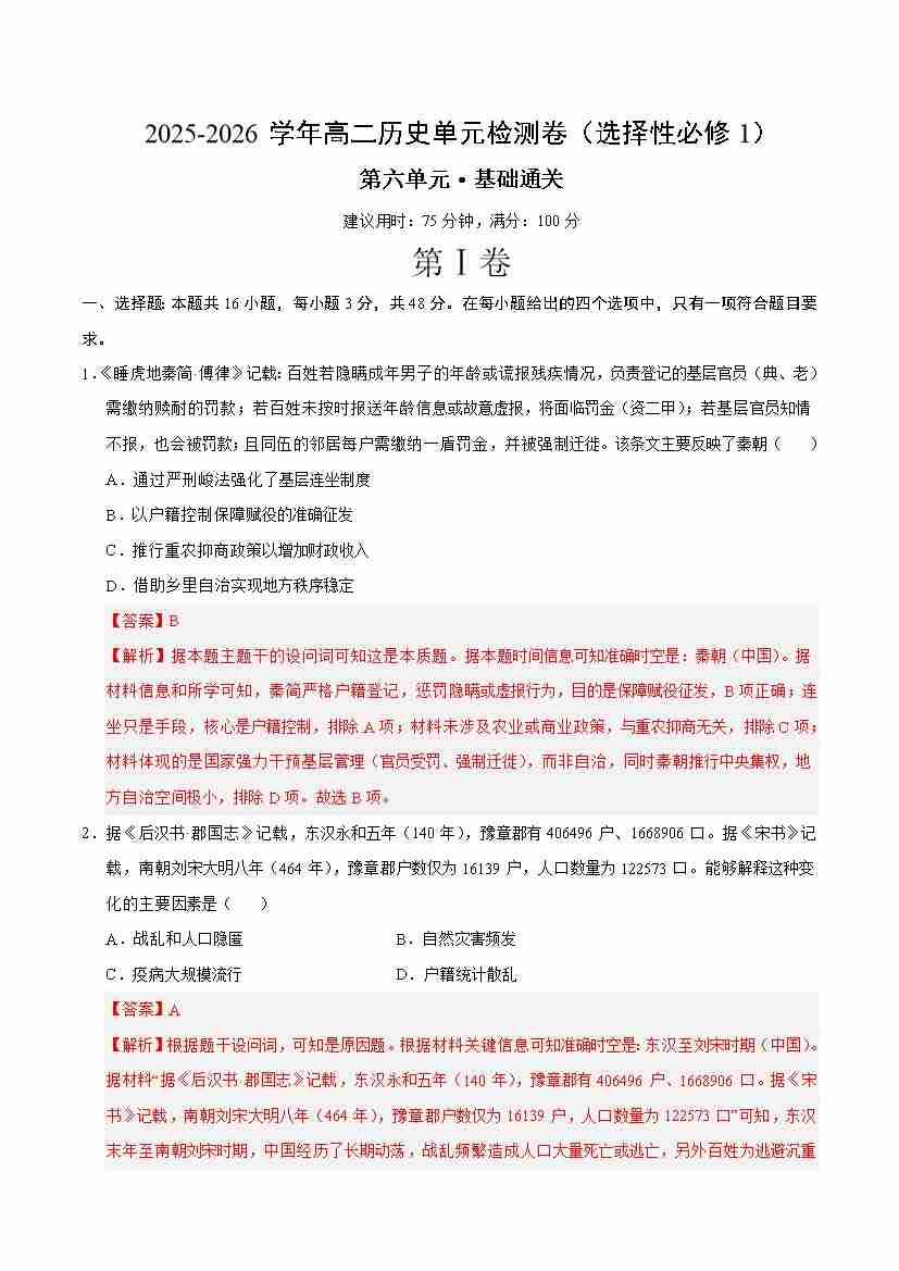 高二历史选择性必修1第六单元测试·基础卷(教师版)
