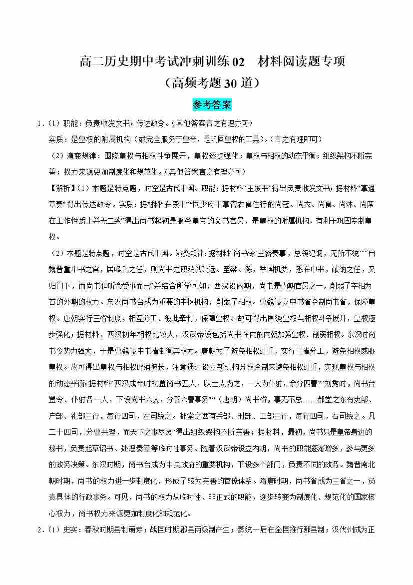高二历史期中复习·材料阅读题高频30题(期中专项训练)(全解全析)