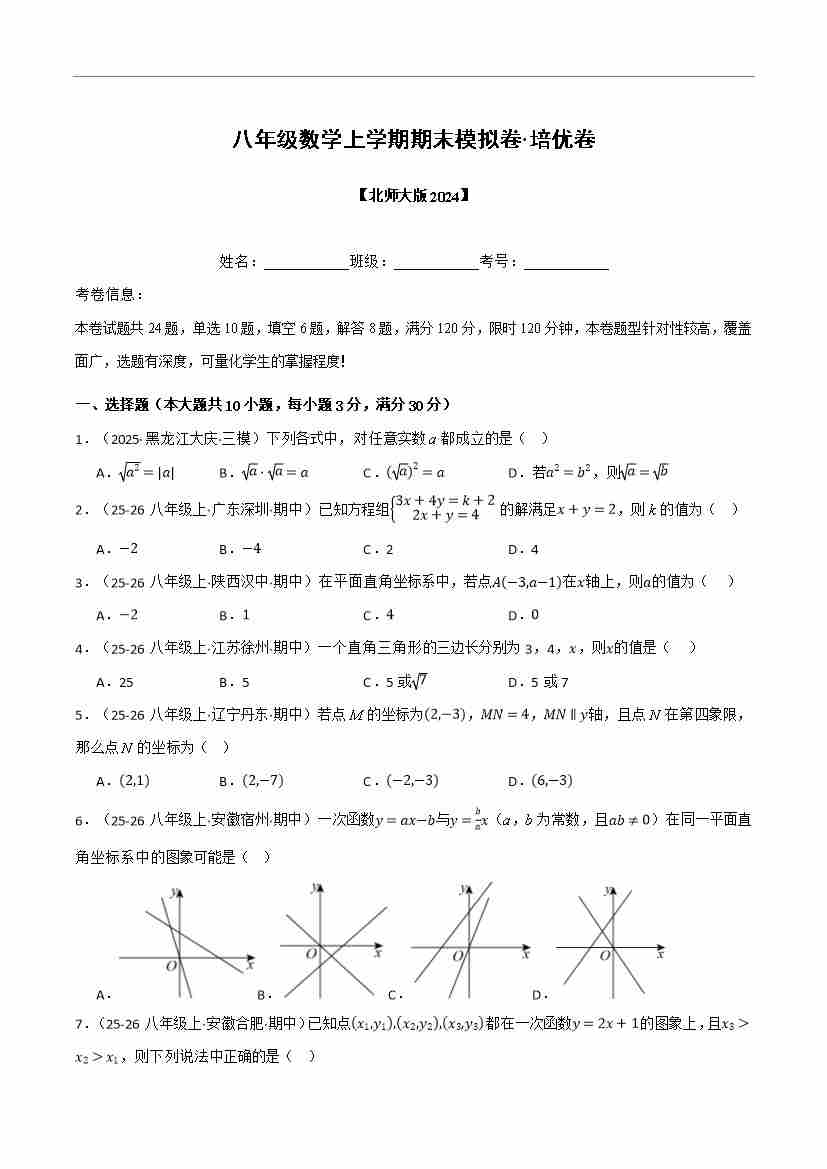 首页 > 全部 > 期末试卷 > 八年级数学上学期期末模拟卷·培优卷(北师大版,举一反三)(原卷版)