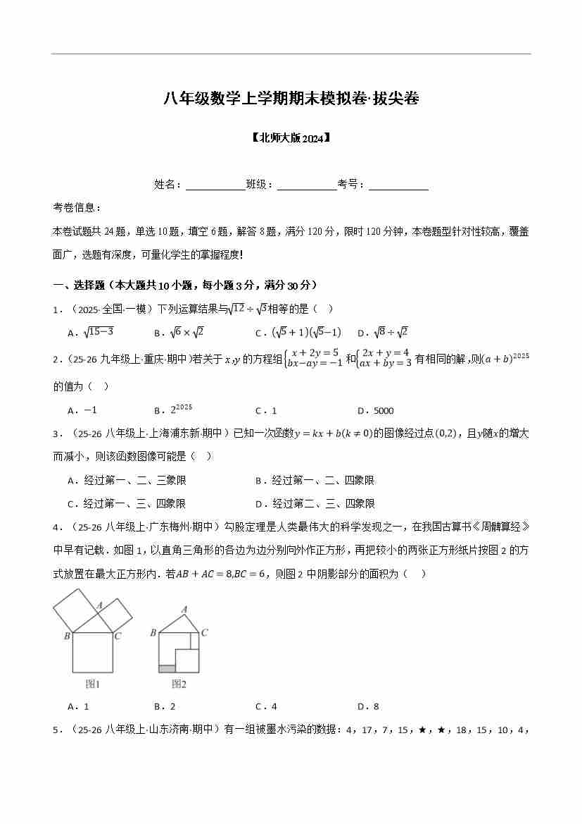 八年级数学上学期期末模拟卷·拔尖卷(北师大版,举一反三)(原卷版)