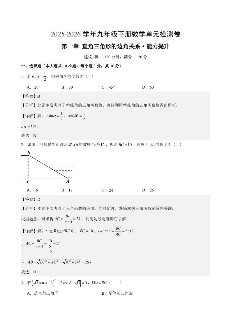 首页 > 全部 > 单元测试 > 九下数学第一章 直角三角形的边角关系测试·提升卷(解析版)