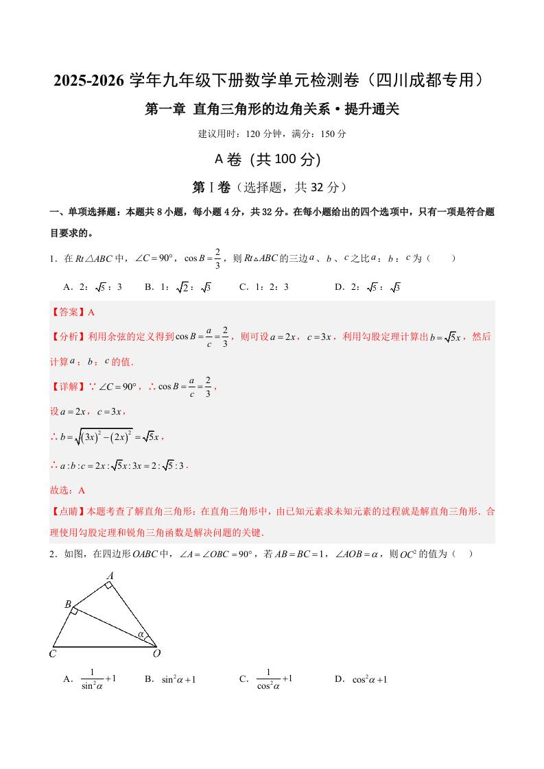 首页 > 全部 > 单元测试 > 九下数学第一章 直角三角形的边角关系测试·提升卷(四川成都专用)(解析版)