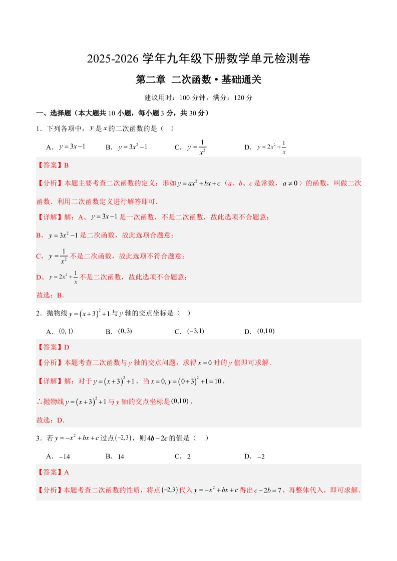 首页 > 全部 > 单元测试 > 九下数学第二章 二次函数测试·基础卷(解析版)