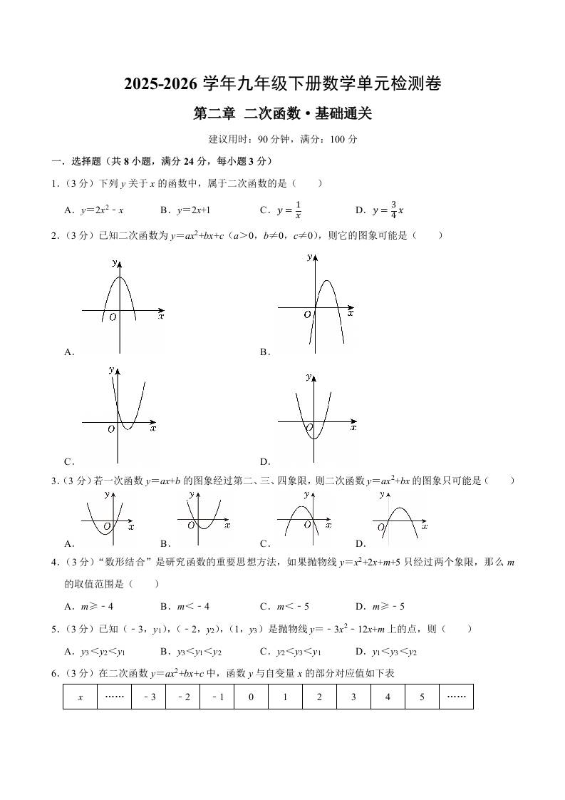 首页 > 全部 > 单元测试 > 九下数学第二章 二次函数测试·基础卷(深圳专用)(考试版A4)