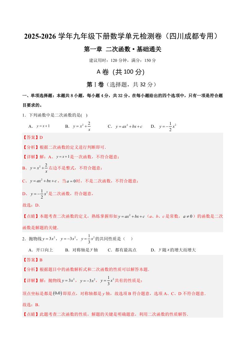 首页 > 全部 > 单元测试 > 九下数学第二章 二次函数测试·基础卷(四川成都专用)(解析版)