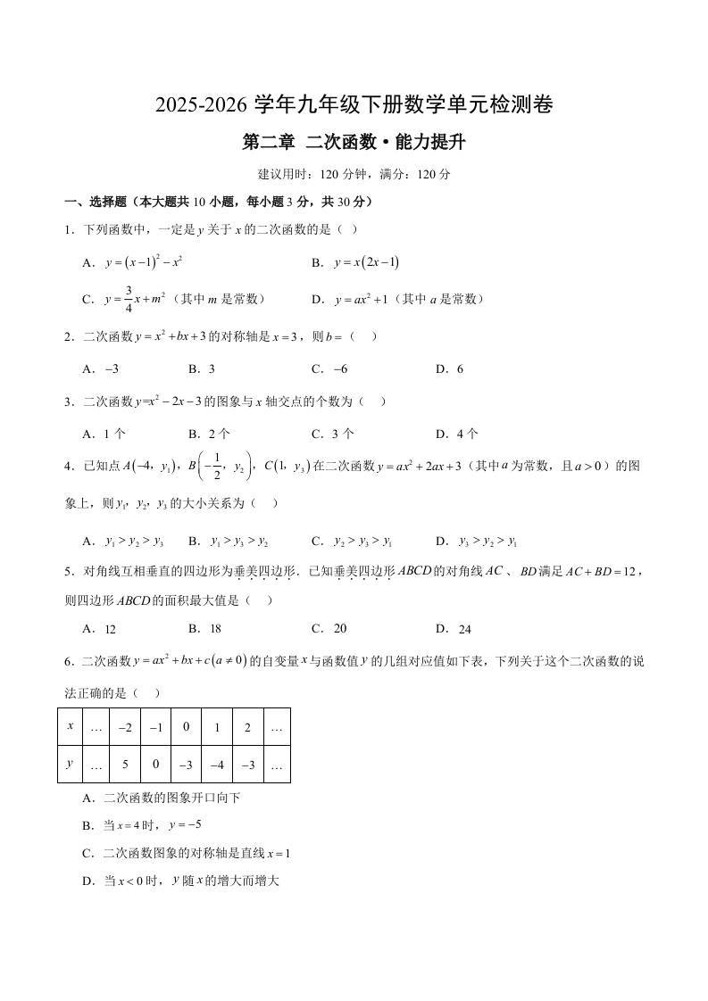 首页 > 全部 > 单元测试 > 九下数学第二章 二次函数测试·提升卷(考试版A4)
