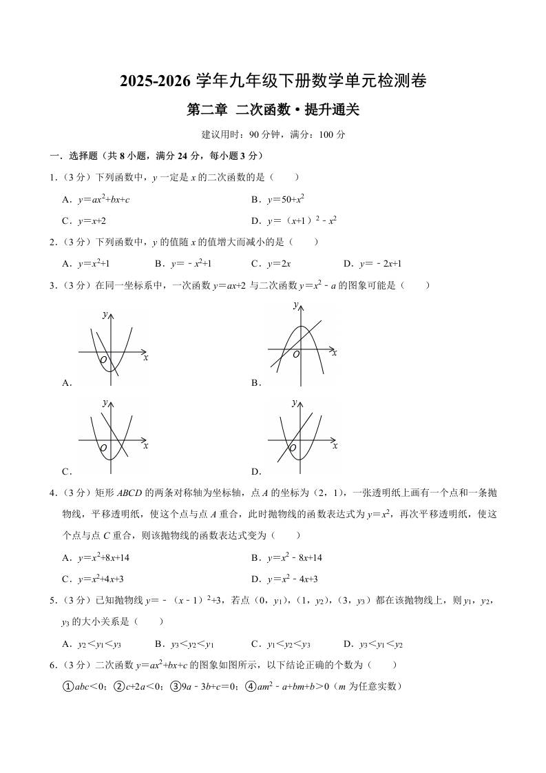 首页 > 全部 > 单元测试 > 九下数学第二章 二次函数测试·提升卷(深圳专用)(考试版A4)