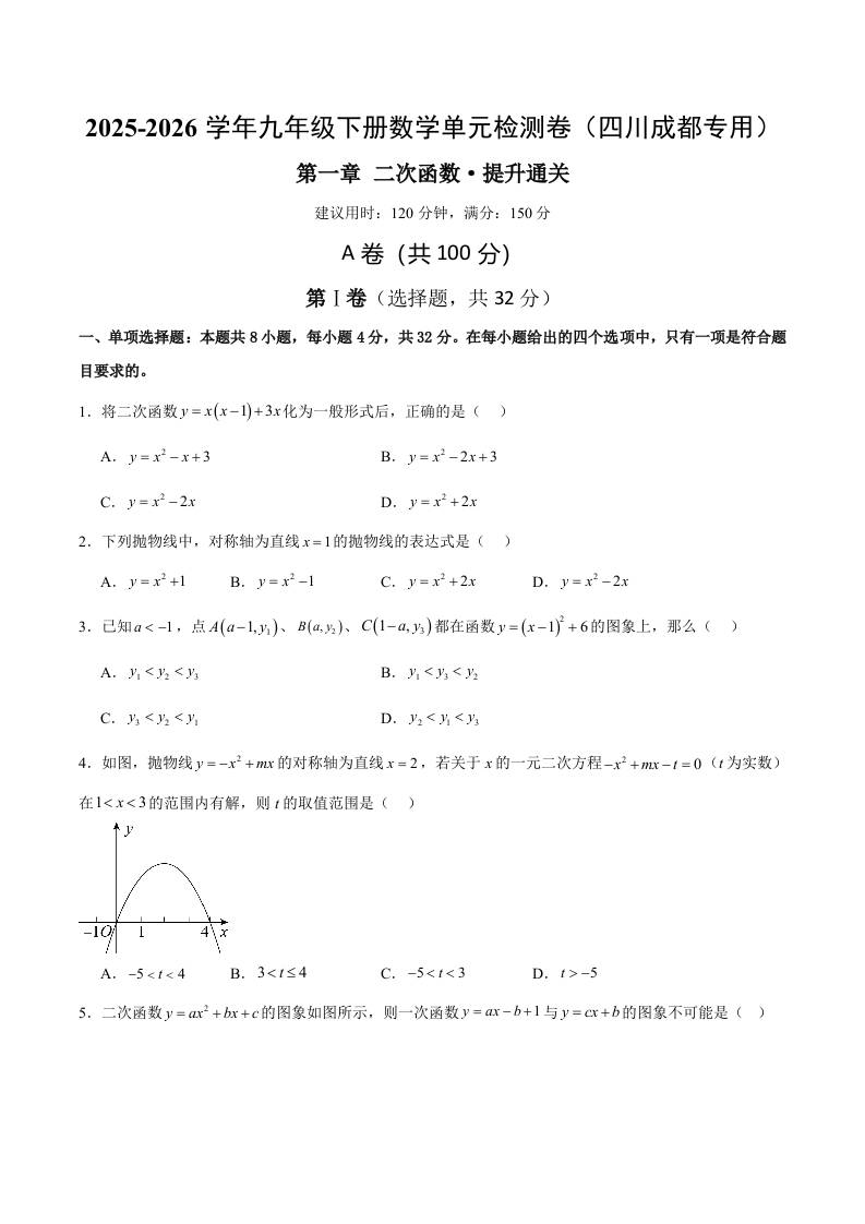 首页 > 全部 > 单元测试 > 九下数学第二章 二次函数测试·提升卷(四川成都专用)(考试版A4)
