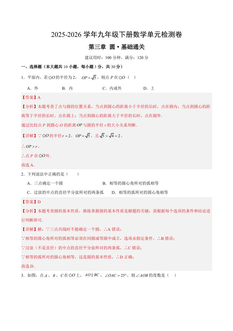 首页 > 全部 > 单元测试 > 九下数学第三章 圆测试·基础卷(解析版)
