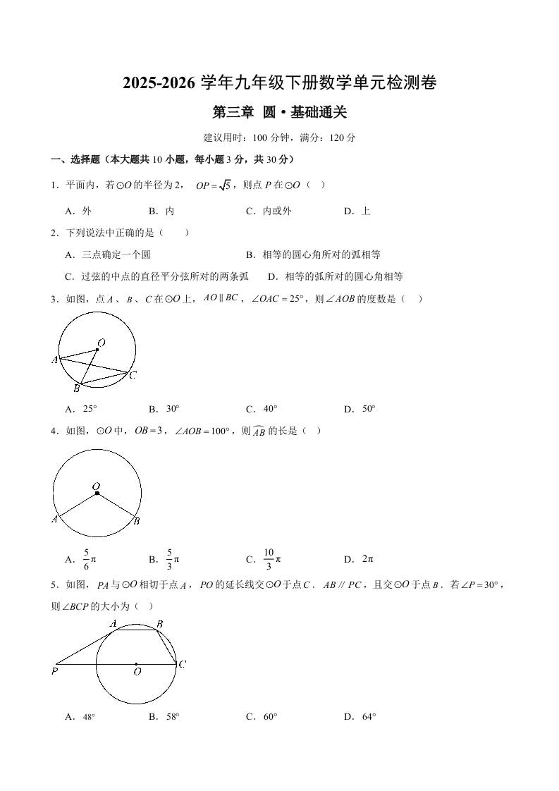 首页 > 全部 > 单元测试 > 九下数学第三章 圆测试·基础卷(考试版A4)