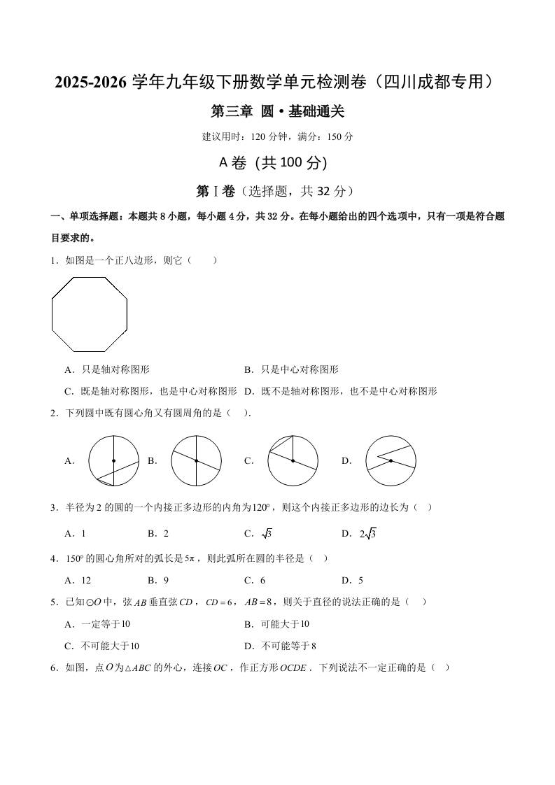 首页 > 全部 > 单元测试 > 九下数学第三章 圆测试·基础卷(四川成都专用)(考试版A4)