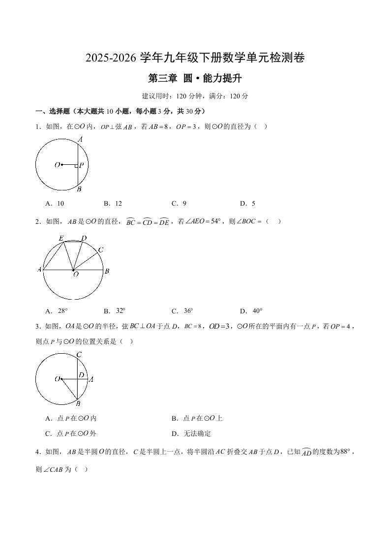 首页 > 全部 > 单元测试 > 九下数学第三章 圆测试·提升卷(考试版A4)
