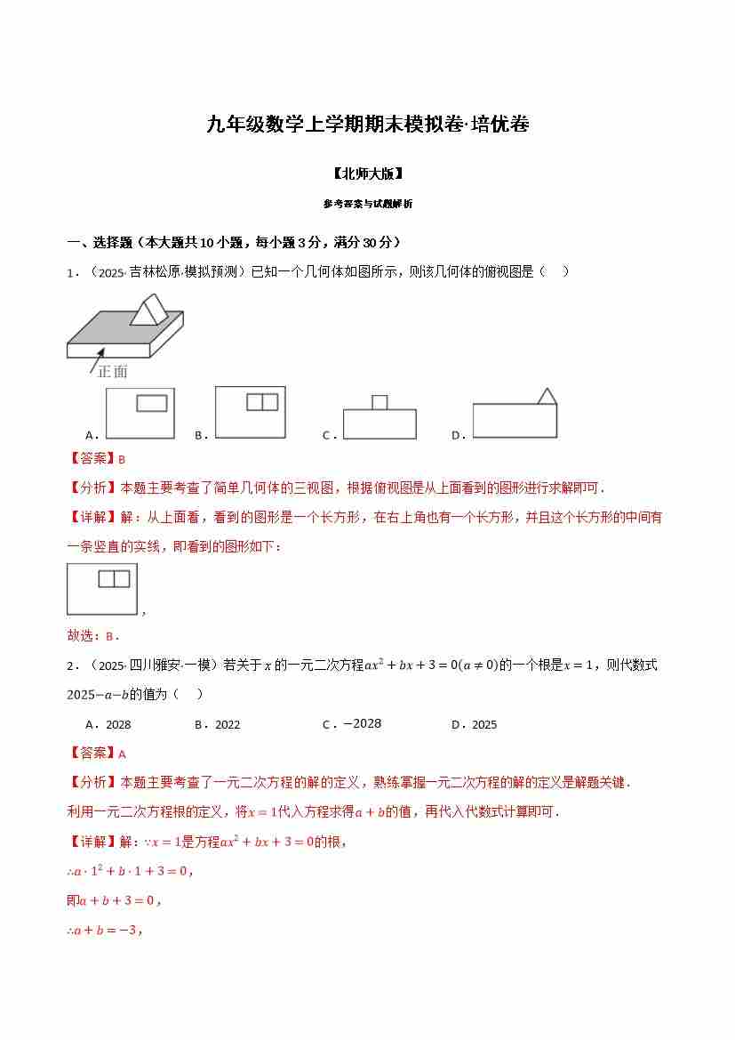 首页 > 全部 > 期末试卷 > 九年级数学上学期期末模拟卷·培优卷(北师大版,举一反三)(解析版)