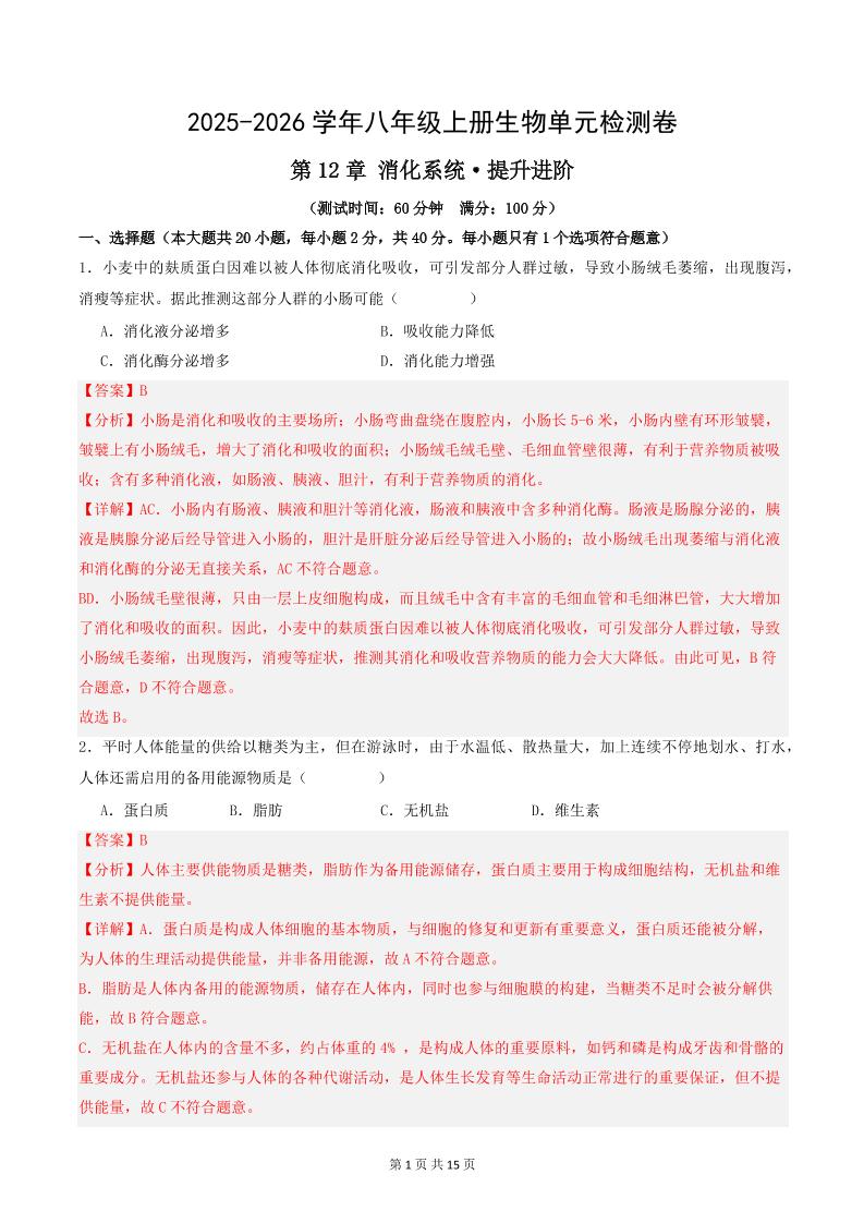 首页 > 全部 > 单元提升卷 > 第12章 消化系统(单元测试·提升卷)(解析版)