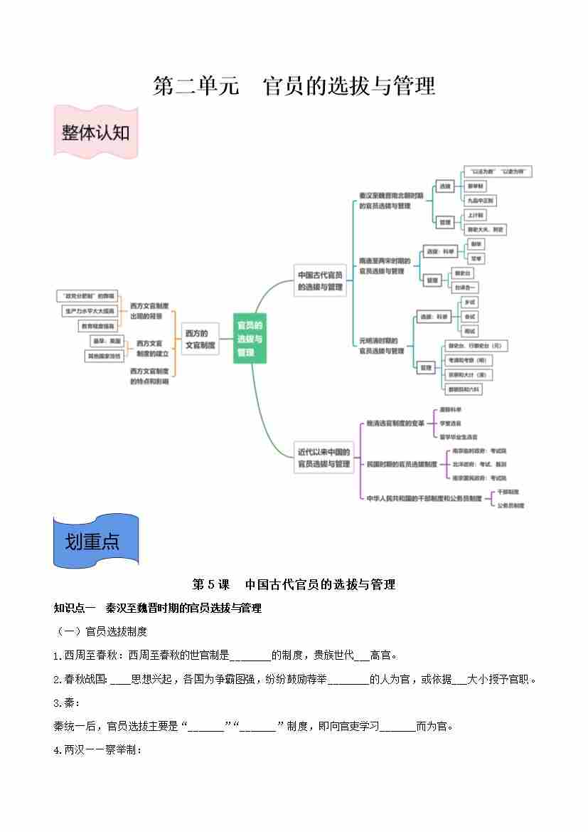 选必1 第二单元 官员的选拔与管理(后附答案)-(统编版•)(含答案)