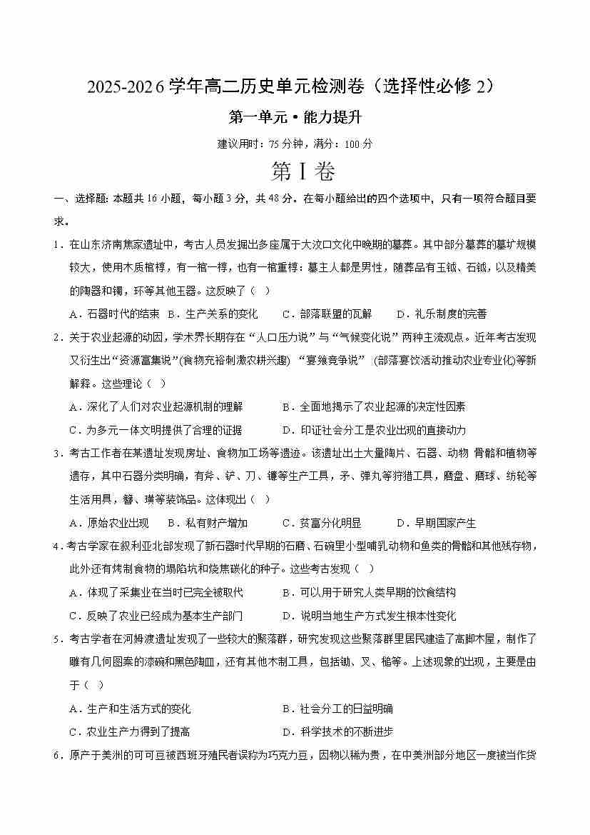 高二历史选择性必修2第一单元测试·提升卷(考试版A4)