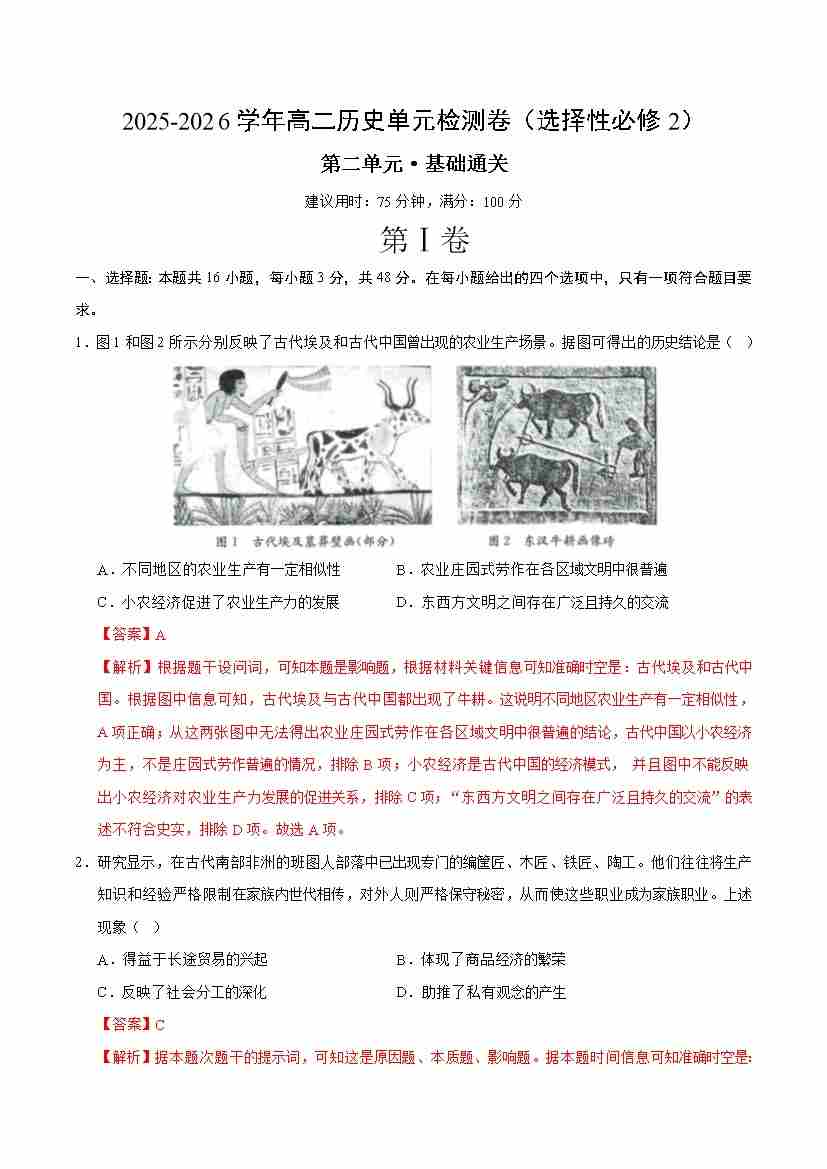 首页 > 全部 > 单元测试 > 高二历史选择性必修2第二单元测试·基础卷(解析版)