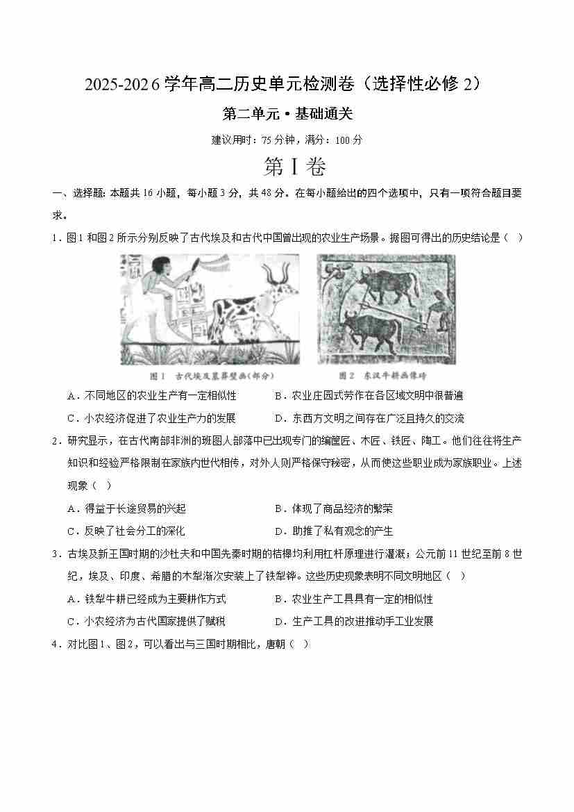高二历史选择性必修2第二单元测试·基础卷(考试版A4)