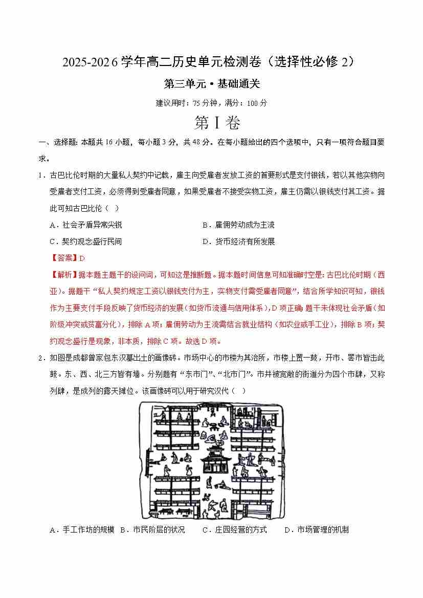 高二历史选择性必修2第三单元测试·基础卷(解析版)