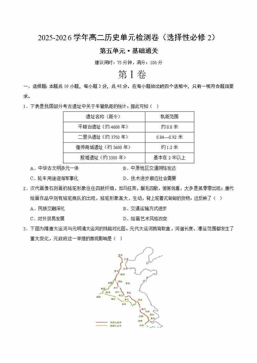 高二历史选择性必修2第五单元测试·基础卷(考试版A4)