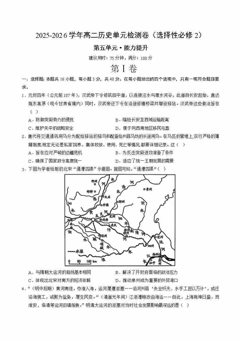 高二历史选择性必修2第五单元测试·提升卷(考试版A4)