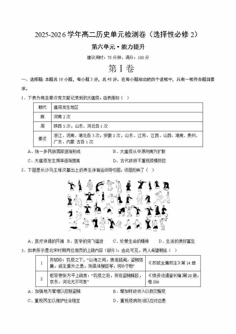 高二历史选择性必修2第六单元测试·提升卷(考试版A4)