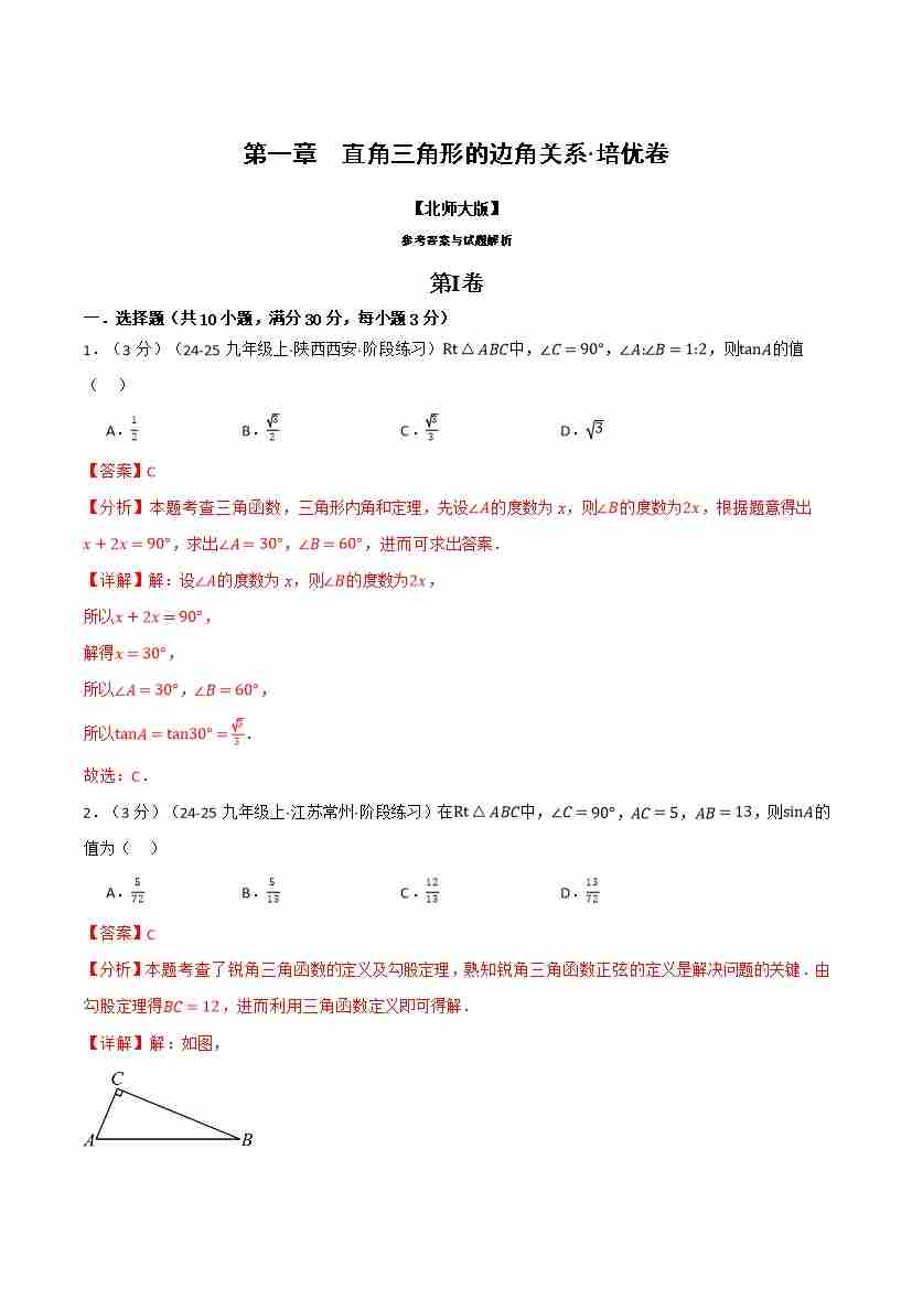 第一章 直角三角形的边角关系(举一反三单元测试·培优卷)(解析版)