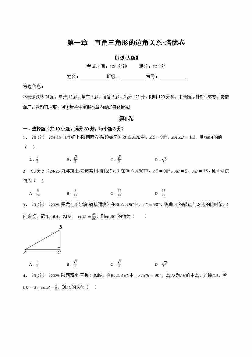 首页 > 全部 > 举一反三 > 第一章 直角三角形的边角关系(举一反三单元测试·培优卷)(原卷版)