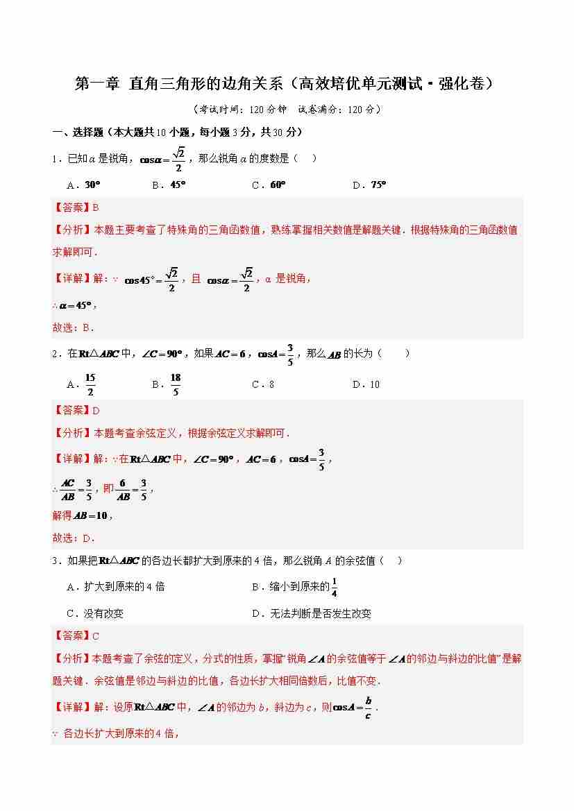 首页 > 全部 > 综合检测 > 第一章 直角三角形的边角关系(高效培优单元测试·强化卷)(解析版)