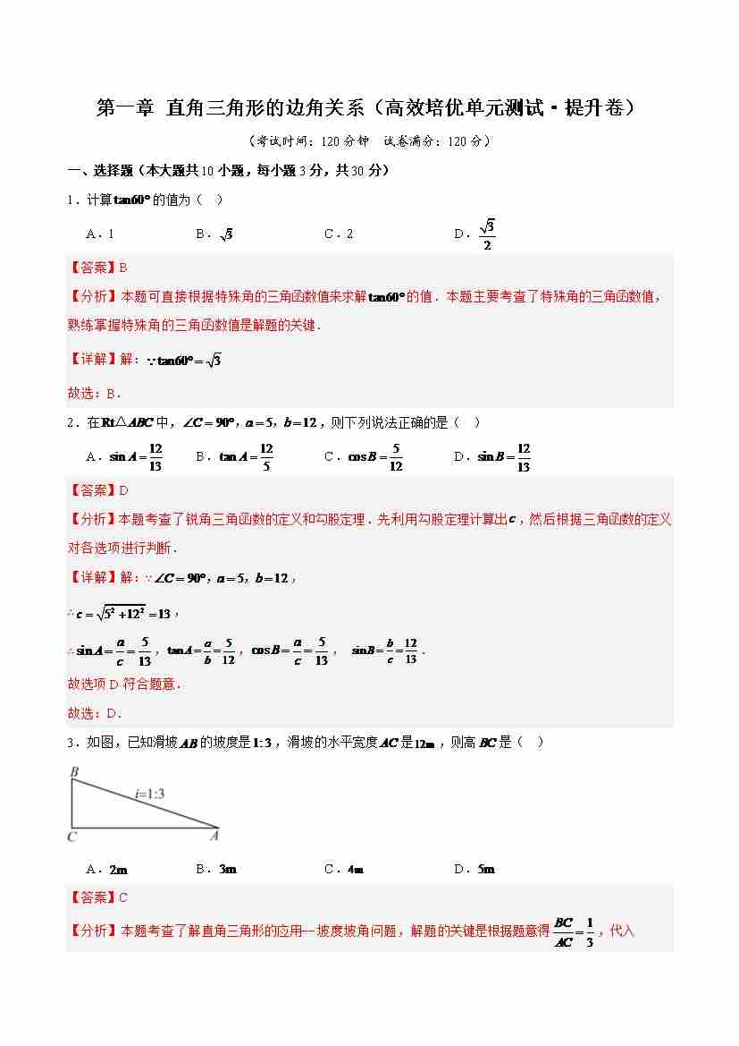 首页 > 全部 > 综合检测 > 第一章 直角三角形的边角关系(高效培优单元测试·提升卷)(解析版)