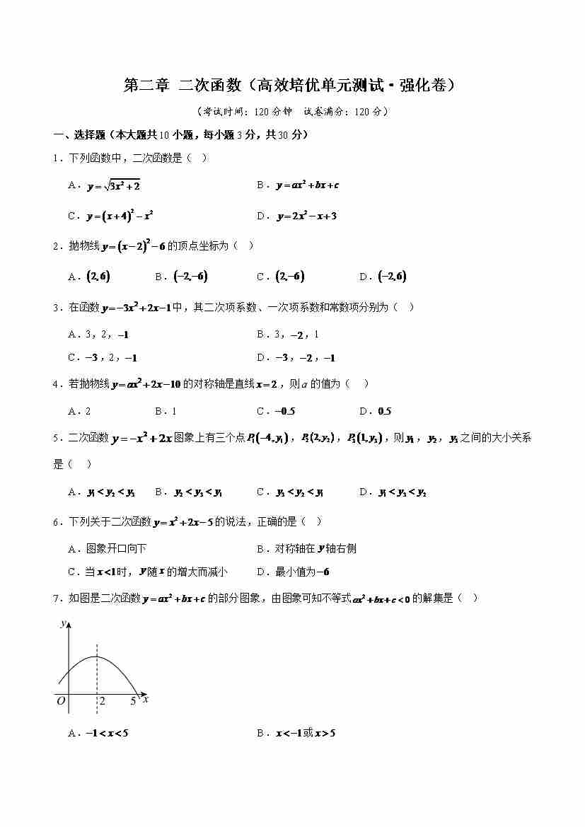 第二章 二次函数(高效培优单元测试·强化卷)(原卷版)