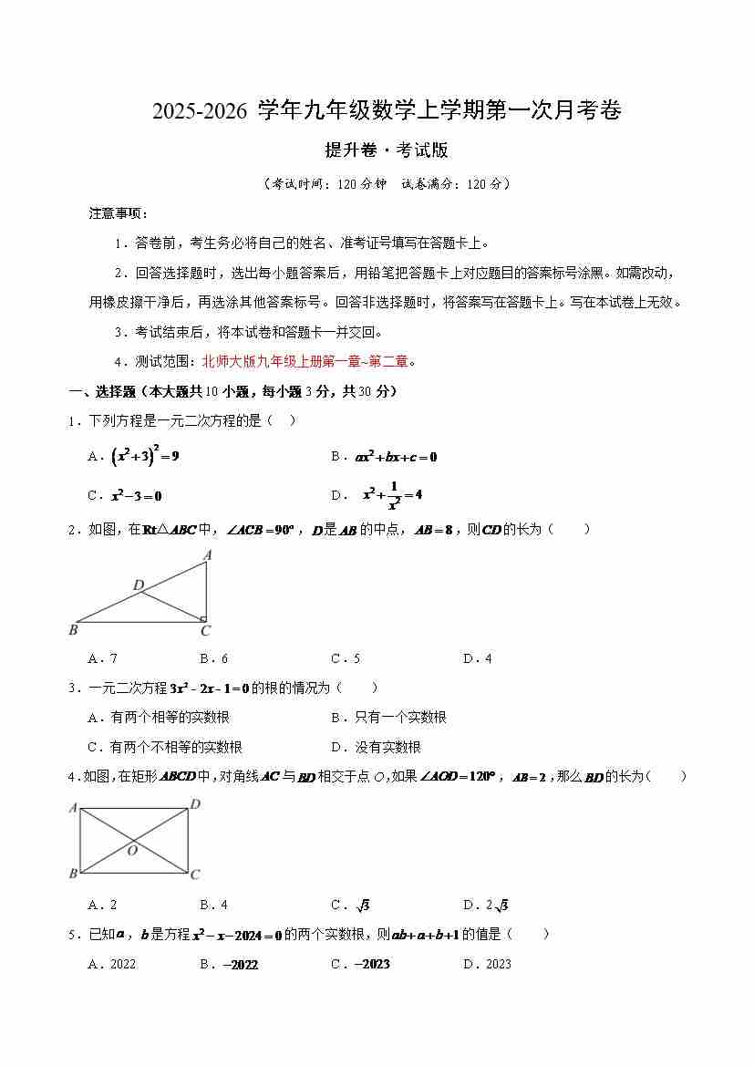 九年级数学上学期第一次月考(高效培优·提升卷)(考试版A4)
