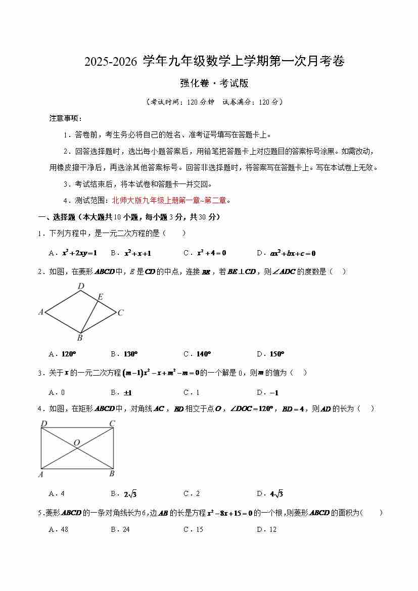 九年级数学上学期第一次月考(北师大版第一~二章,高效培优·强化卷)(考试版A4)