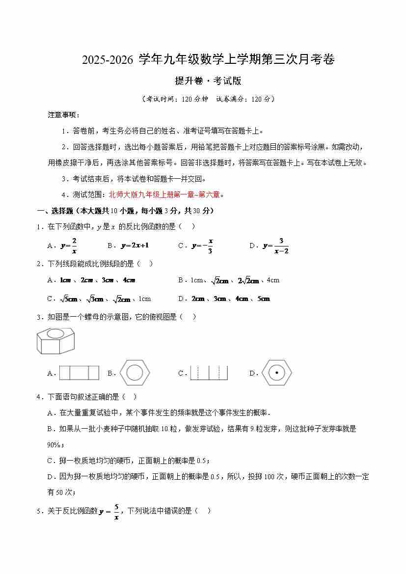 首页 > 全部 > 第三次月考 > 九年级数学上学期第三次月考(北师大版第一章~第六章,高效培优·提升卷)(考试版A4)
