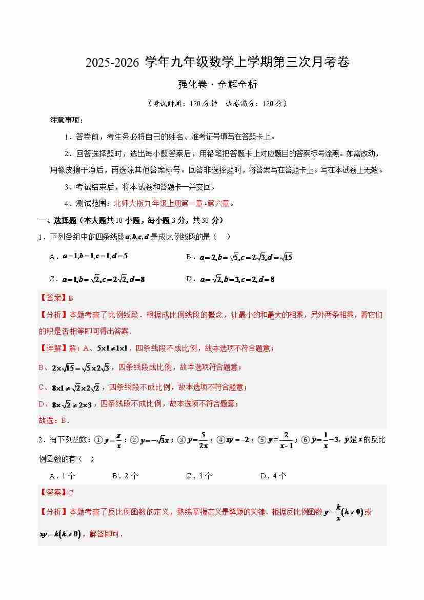 首页 > 全部 > 第三次月考 > 九年级数学上学期第三次月考(北师大版,高效培优·强化卷)(全解全析)