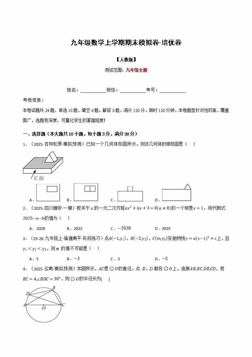 九年级数学上学期期末模拟卷·培优卷(人教版,举一反三)(原卷版)
