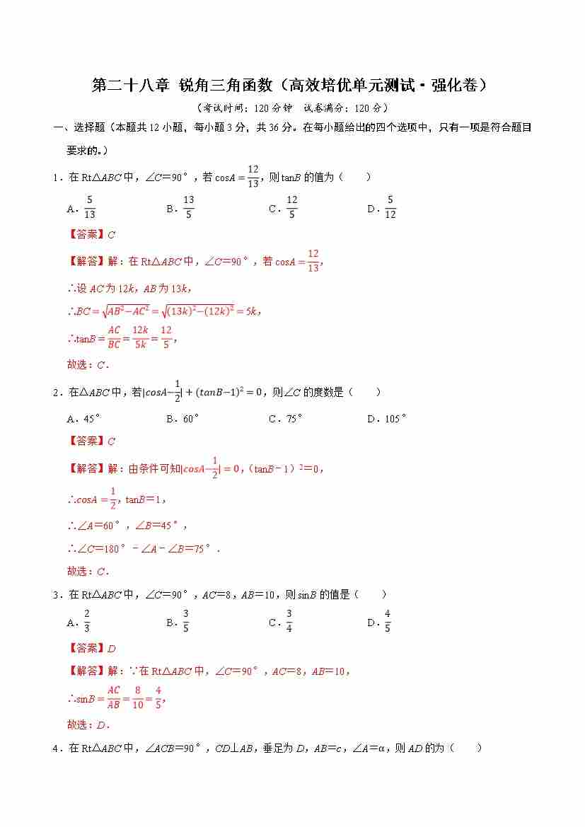 第二十八章 锐角三角函数(高效培优单元测试·强化卷)(解析版)