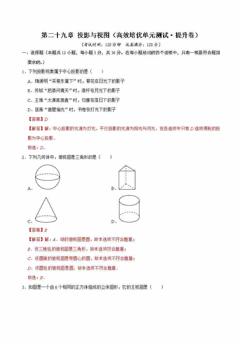 首页 > 全部 > 单元测试 > 第二十九章 投影与视图(高效培优单元测试·提升卷)(解析版)