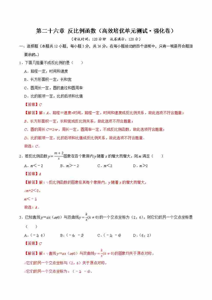 第二十六章 反比例函数(高效培优单元测试·强化卷)(解析版)