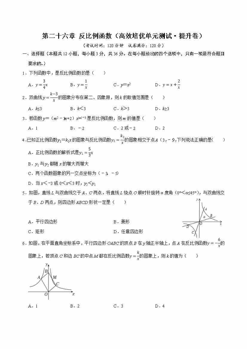 第二十六章 反比例函数(高效培优单元测试·提升卷)(原卷版)
