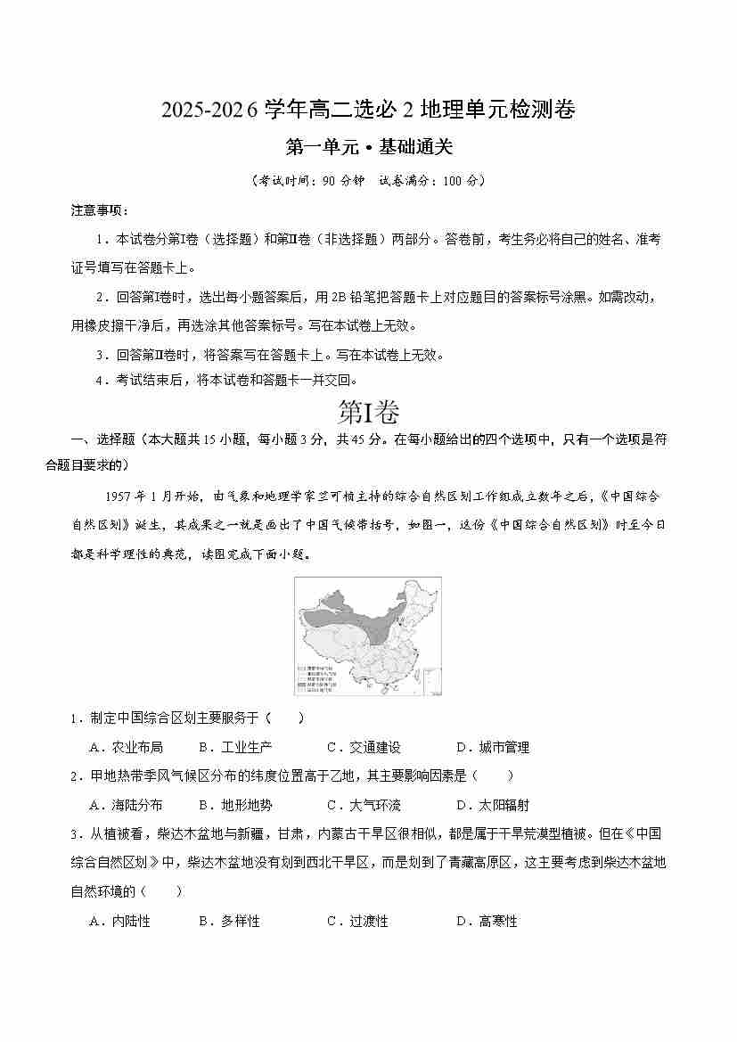 高二地理第一章《区域与区域发展》测试·基础卷(考试版A4)