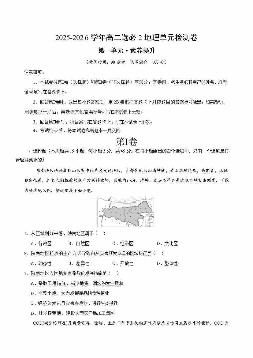 高二地理第一章《区域与区域发展》测试·提升卷(考试版A4)