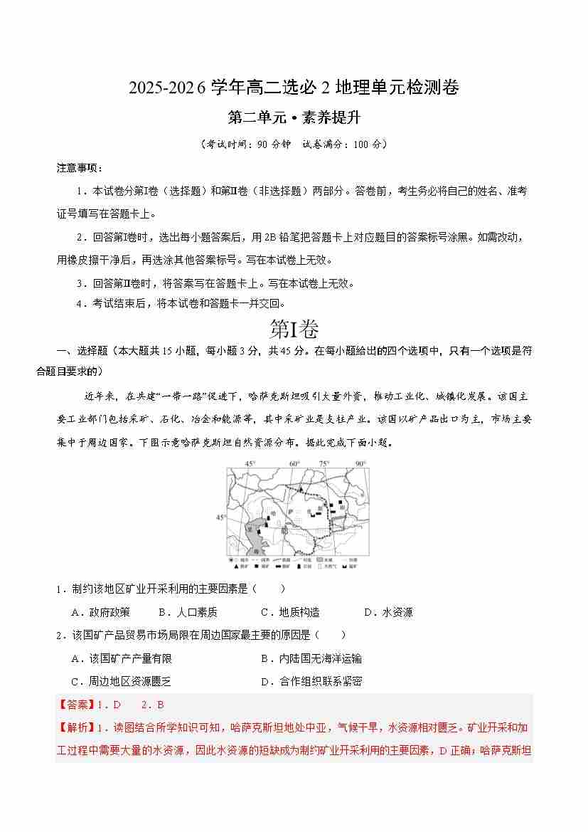 首页 > 全部 > 单元测试 > 第二章《资源、环境与区域发展》 测试·提升卷(解析版)