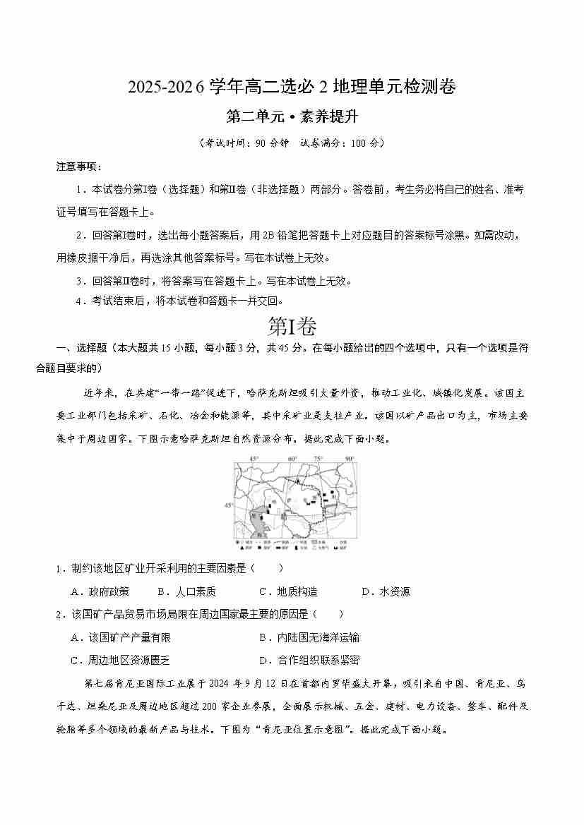 首页 > 全部 > 单元测试 > 第二章《资源、环境与区域发展》测试·提升卷(考试版A4)
