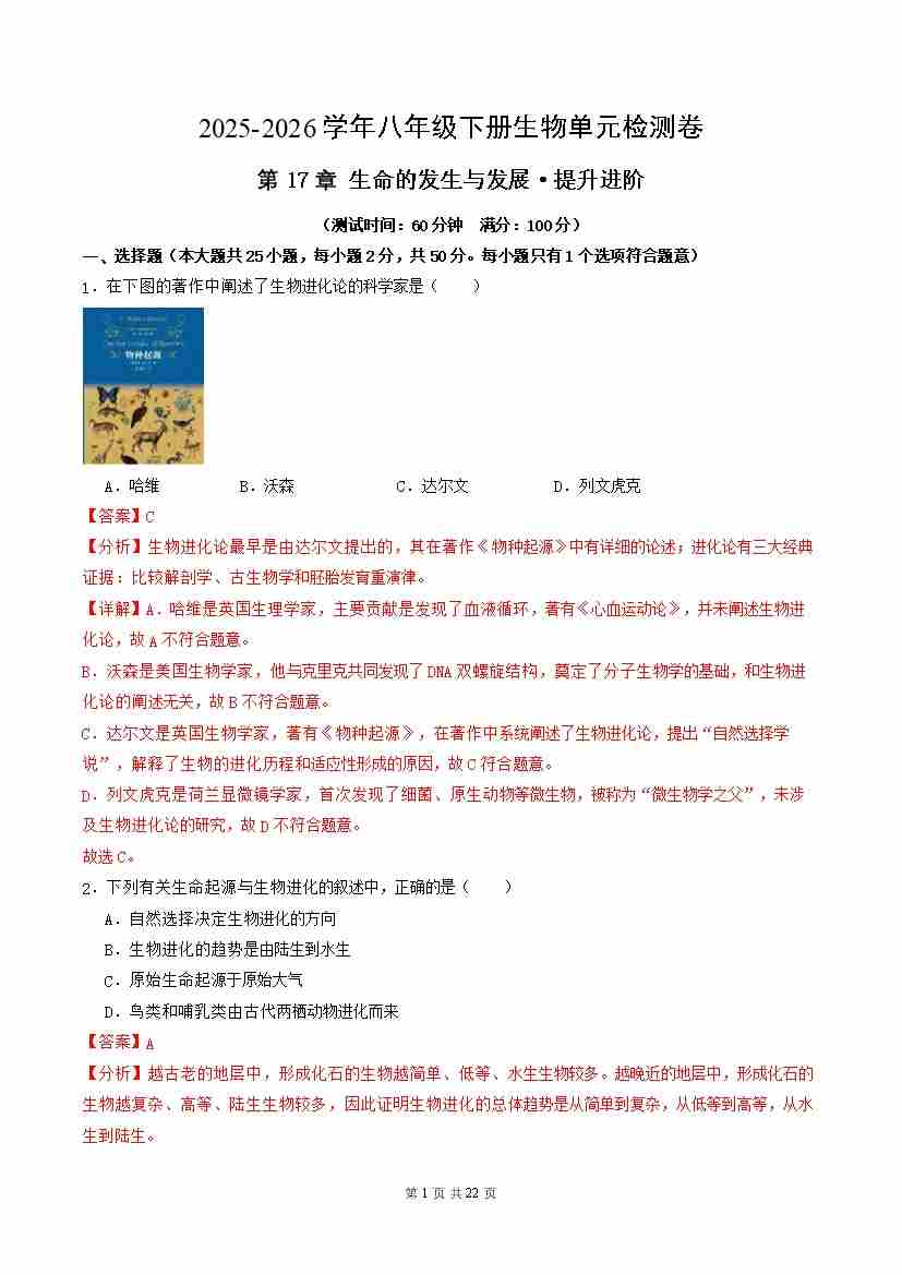 首页 > 全部 > 单元提升卷 > 第17章 生命的发生与发展 (单元测试·提升卷)(解析版)