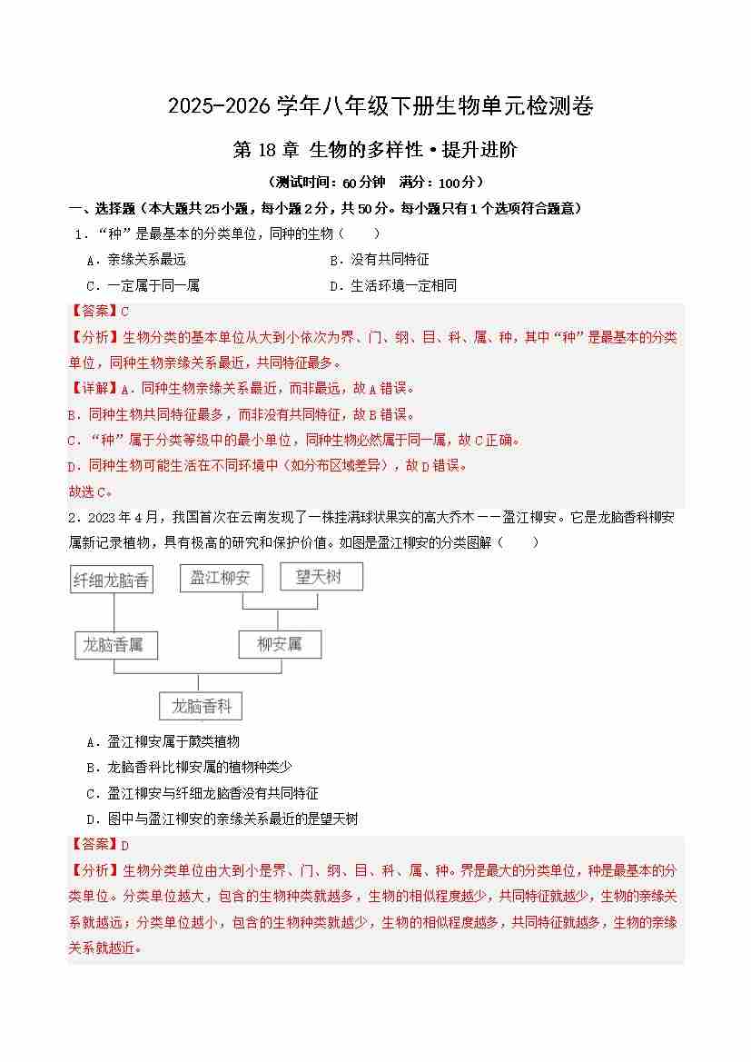 第18章 生物的多样性(单元测试·提升卷)(解析版)